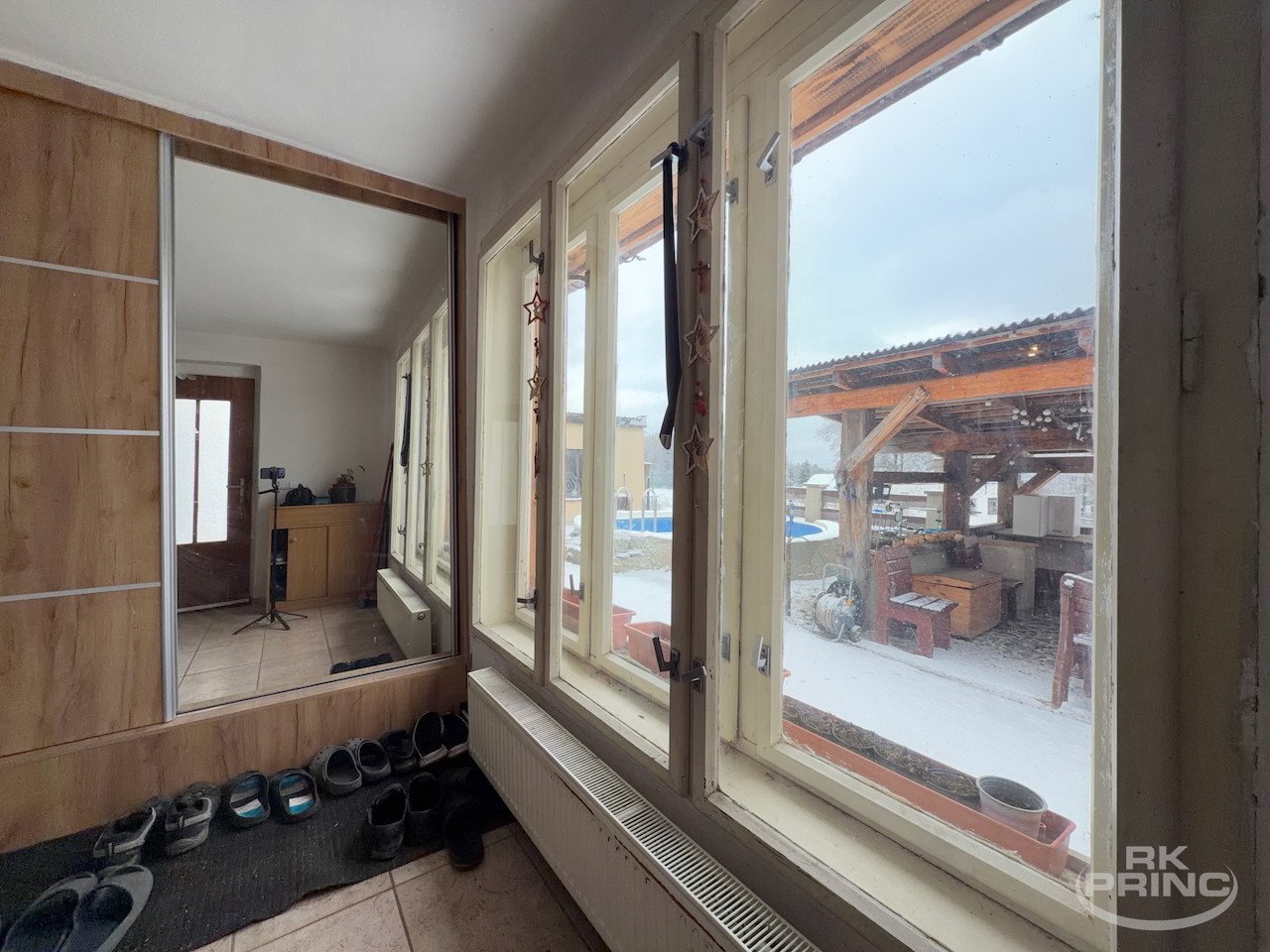 přízemí: veranda, dva pokoje, kuchyň, koupelna, samostatné WC, spíž a vstup do sklepa