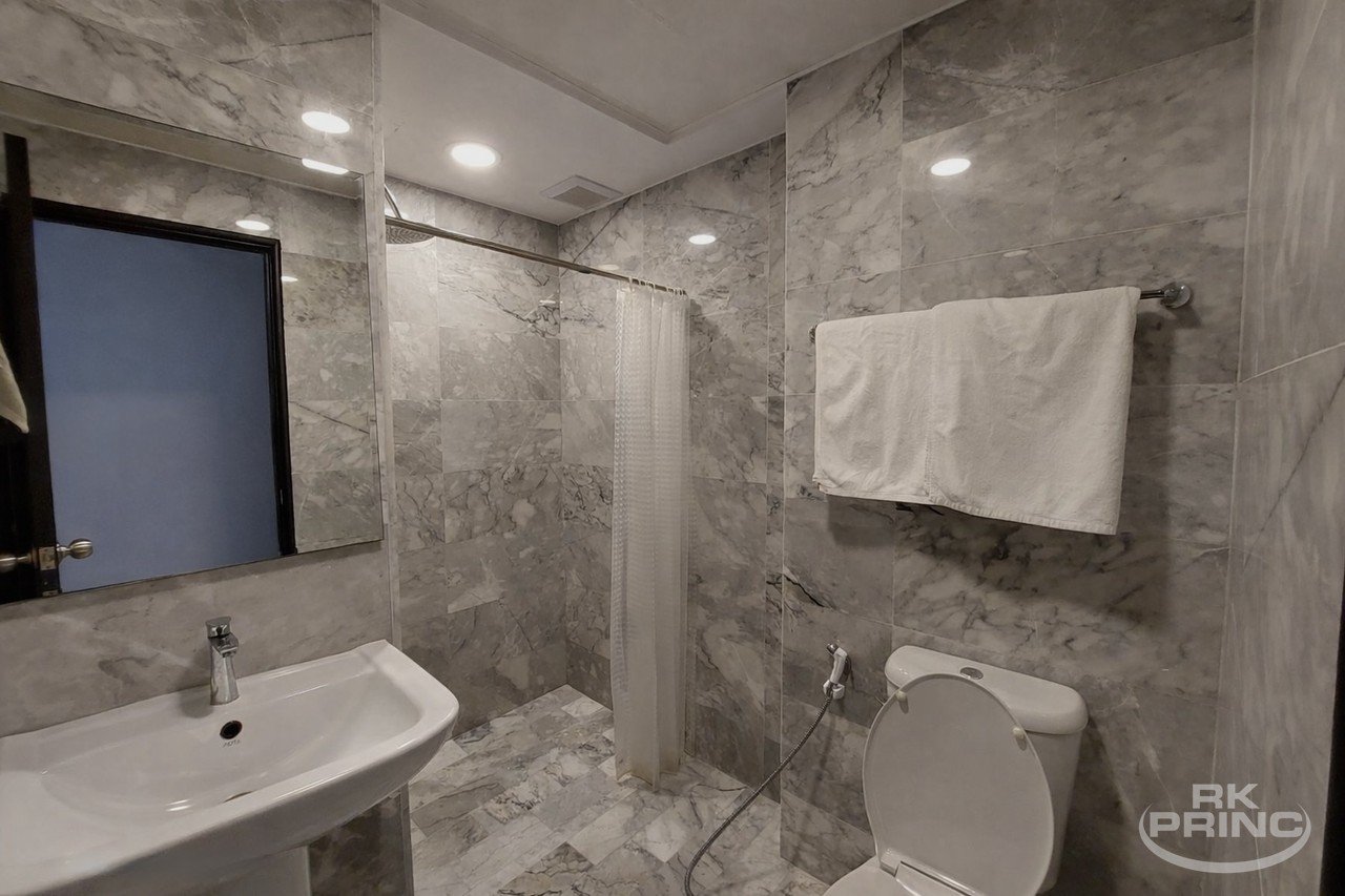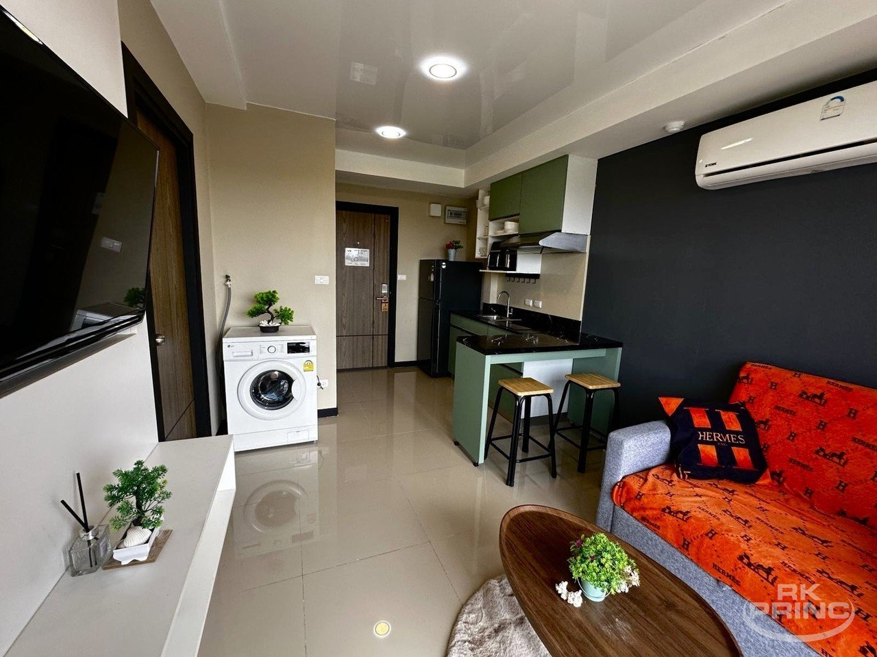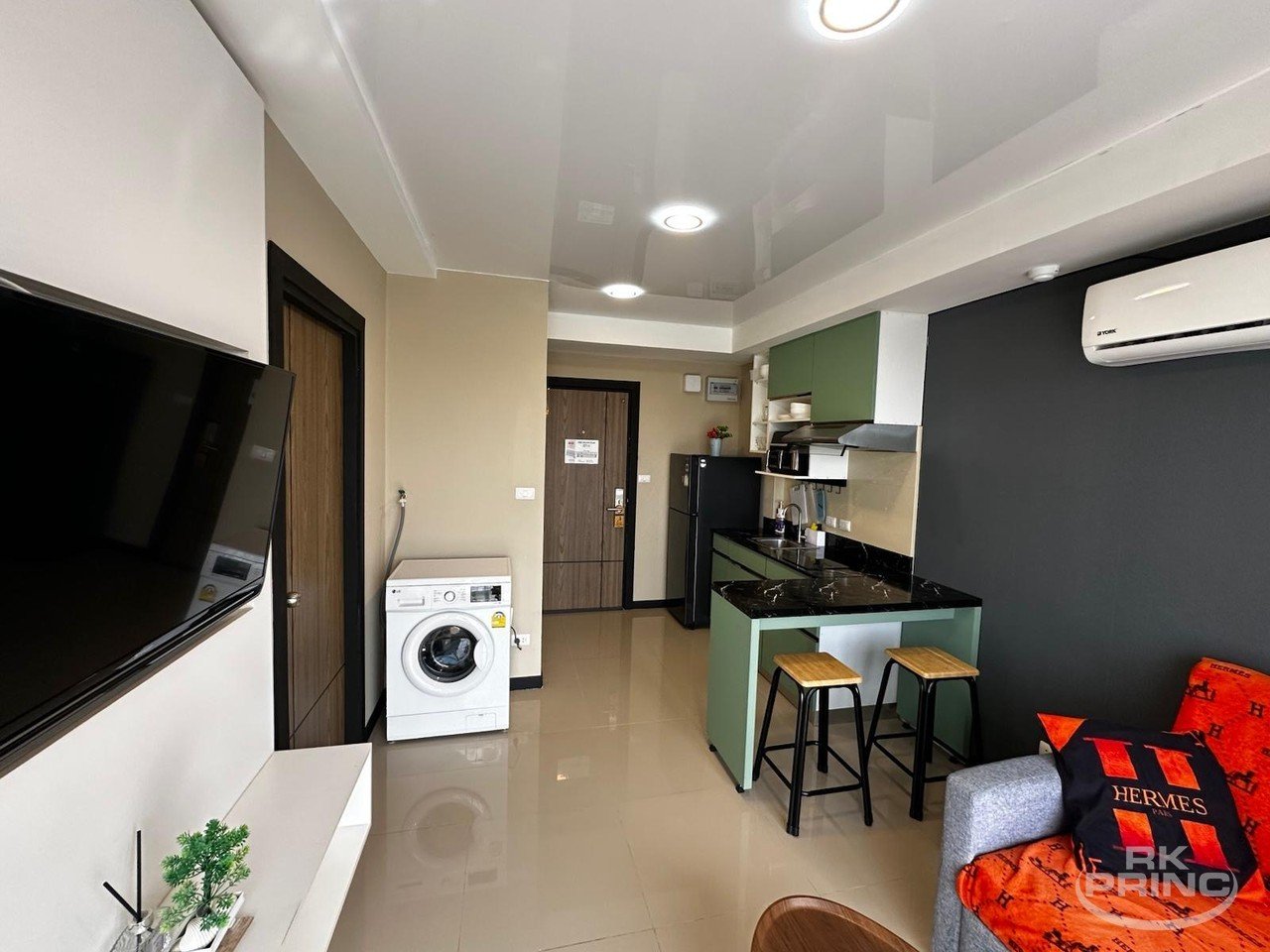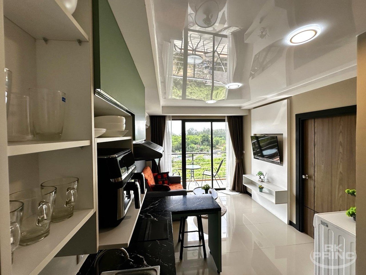 Interiér je moderní a funkční – kuchyňská linka s úložným prostorem, barový pult, klimatizace, vestavěné skříně, TV a vlastní pračka. Součástí je také elegantní koupelna obložená mramorovým dekorem se sprchovým koutem. Apartmán je plně vybaven a připraven k okamžitému užívání nebo k pronájmu bez nutnosti dalších investic.