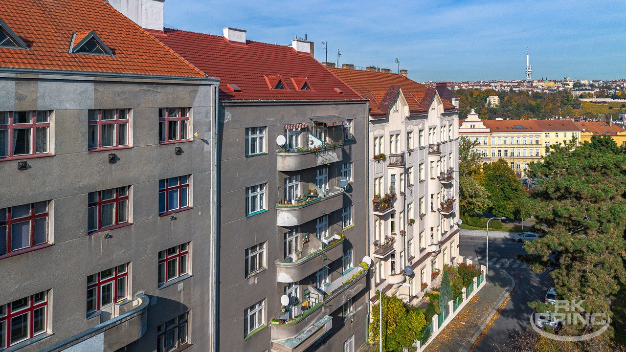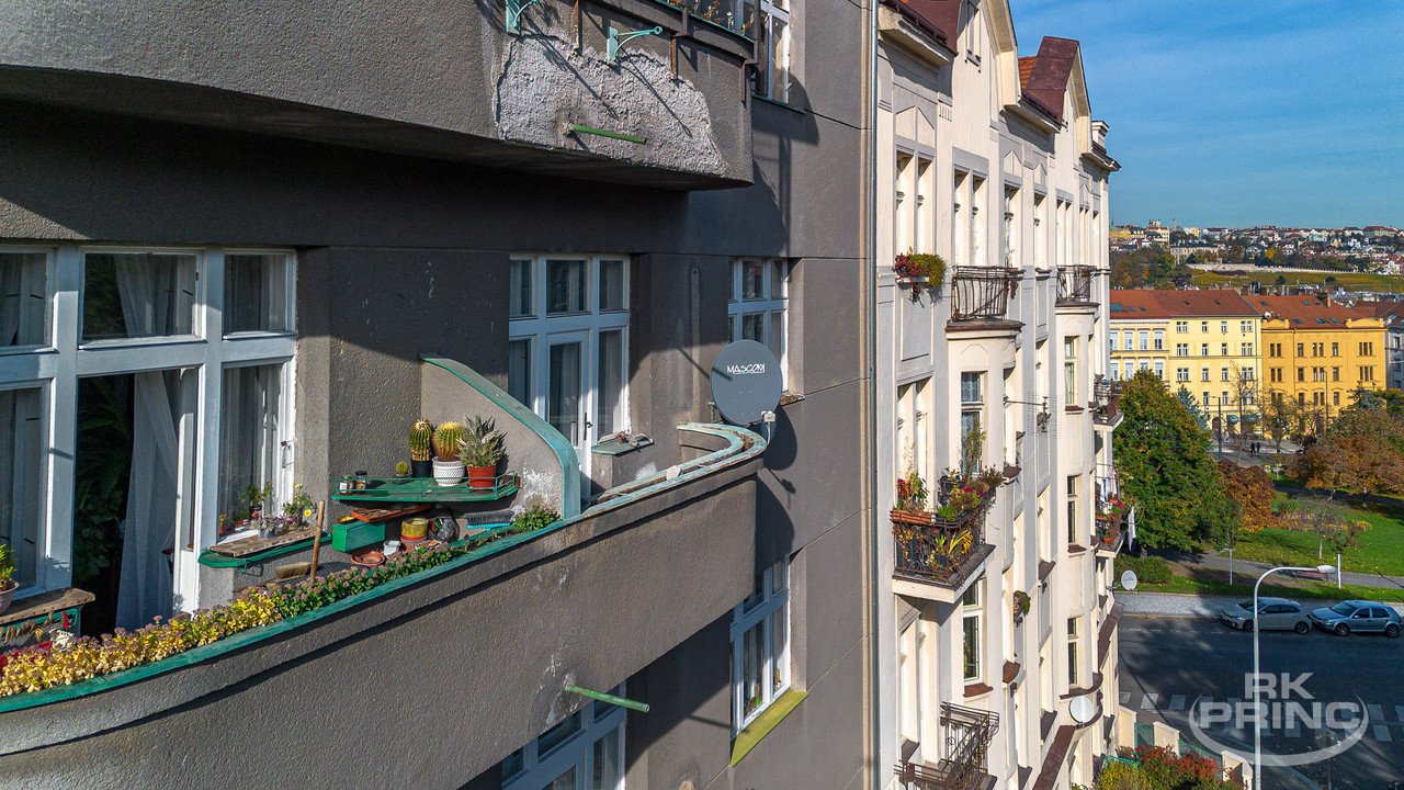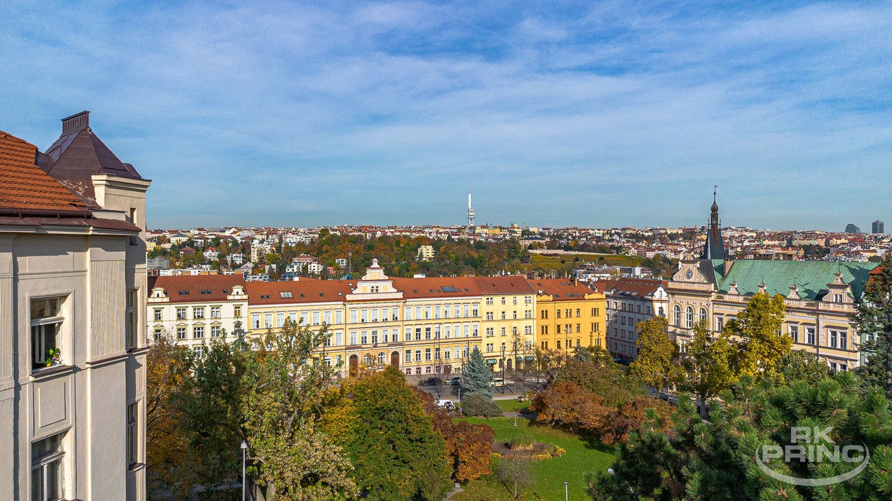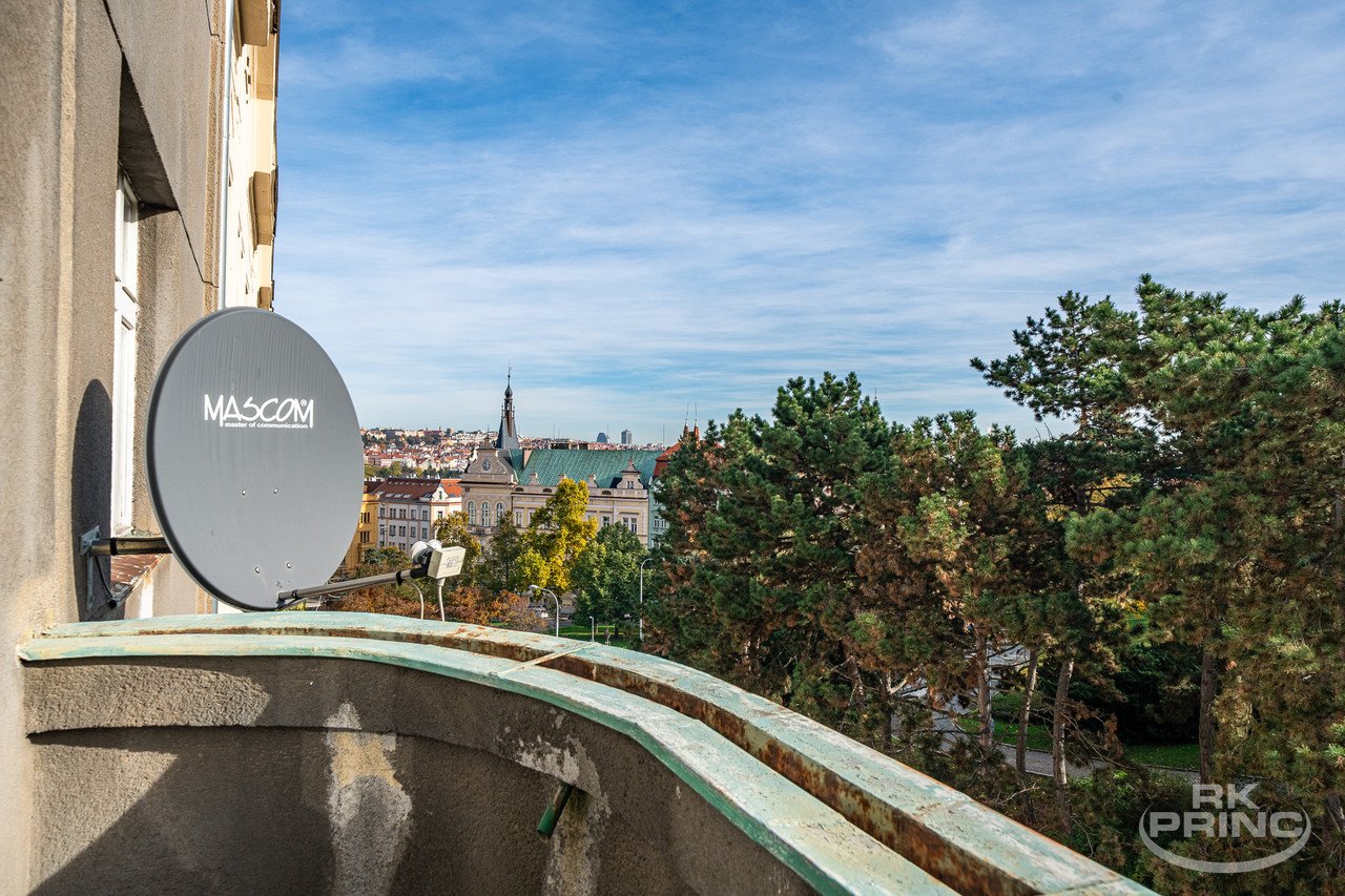 Z obývacího pokoje je vstup na balkon s výhledem směrem na Vinohrady a do panoramatu města.