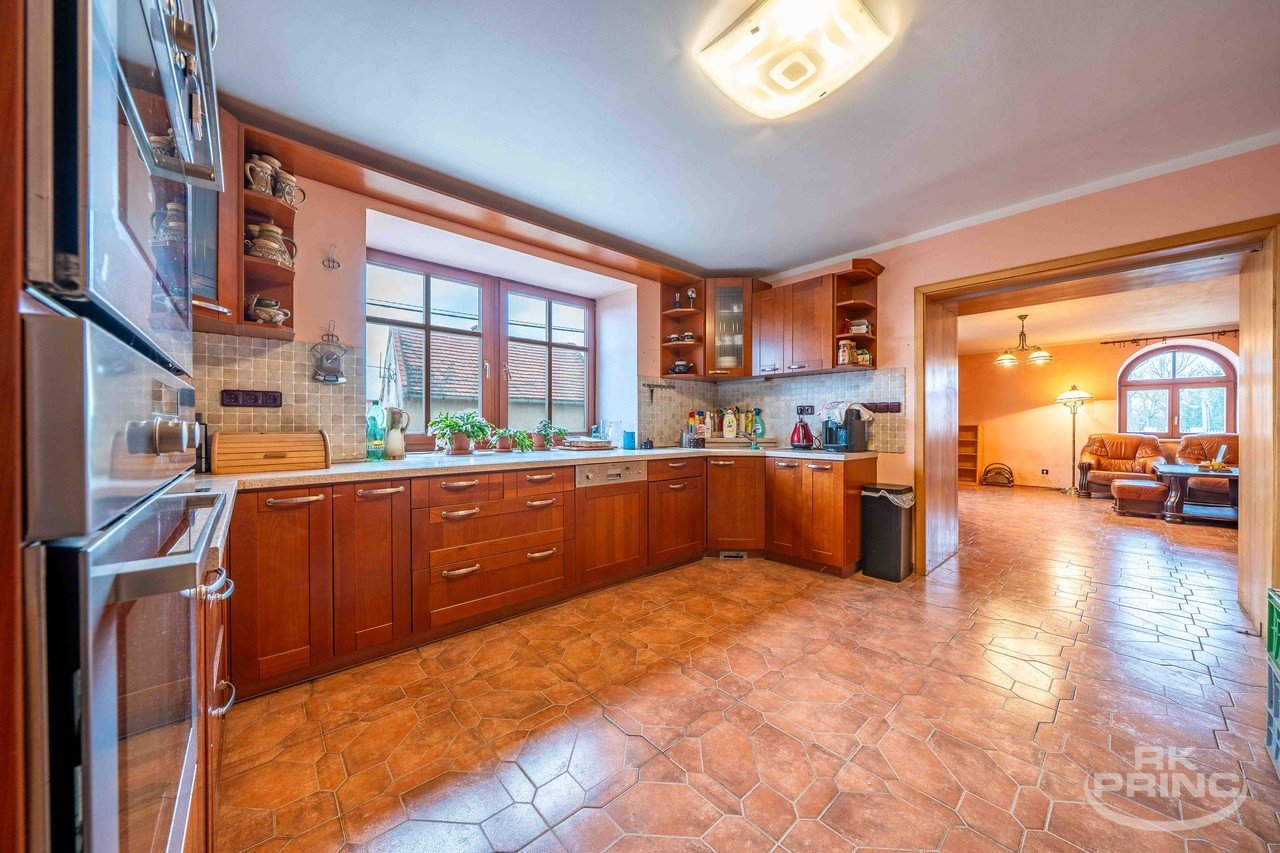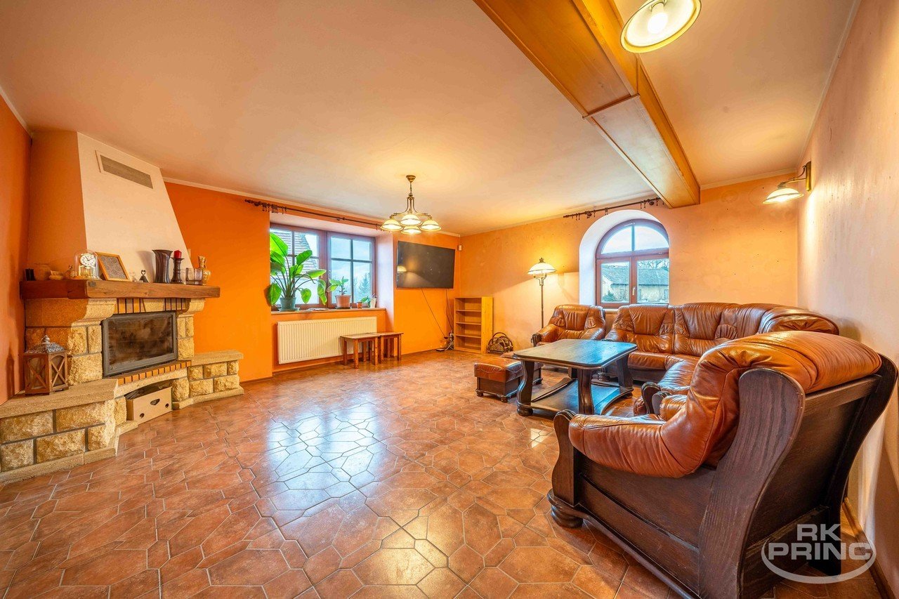 Hlavní dům o dispozici 5+1 a užitné ploše 207 m² je připraven k okamžitému bydlení. Interiér je kvalitně provedený s použitím masivního dřeva, kamene a italské dlažby. V přízemí se nachází prostorný obývací pokoj s krbem, kuchyně, technické zázemí a unikátní místnost s klenutým stropem. V patře jsou čtyři velké pokoje, koupelna a vstup na půdu.