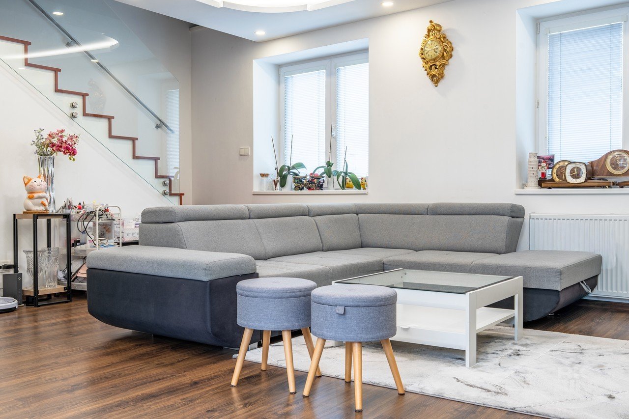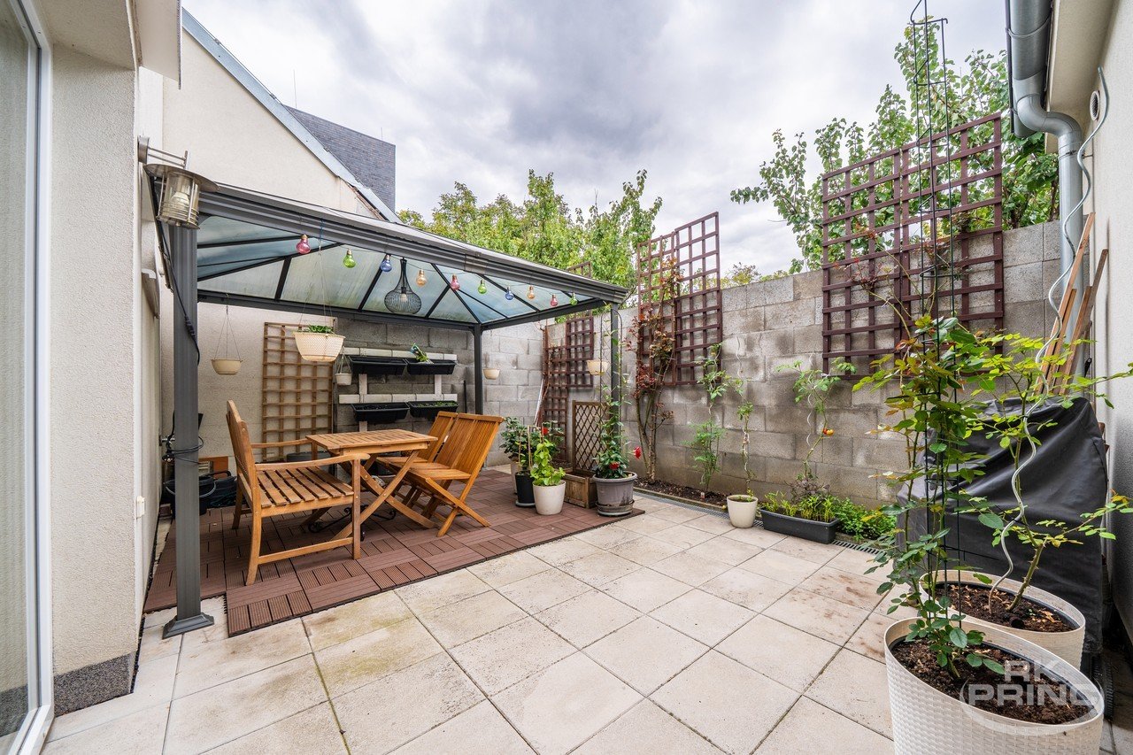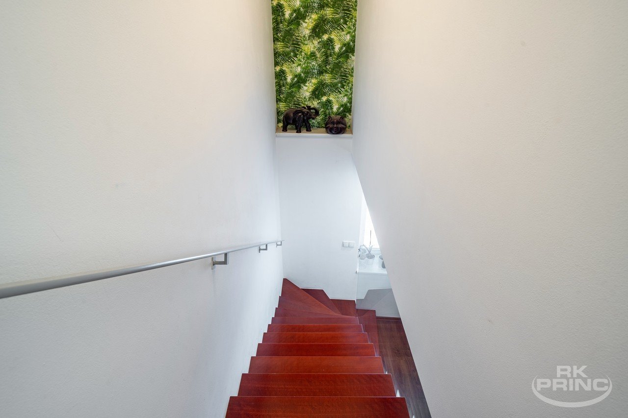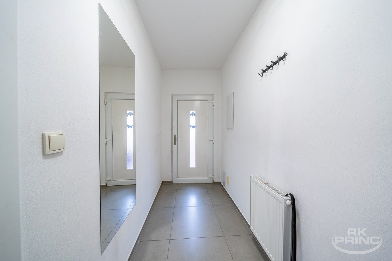 V přízemí se nachází vstupní předsíň a menší neprůchozí pokoj, který může sloužit jako šatna, pracovna nebo pokoj pro hosty. Dále zde najdete prostorný, světlý obývací pokoj propojený s kuchyní, ze které je přímý vstup na soukromou terasu – ideální místo pro relaxaci. Součástí kuchyně je praktická spíž. V přízemí se dále nachází koupelna se sprchovým koutem, toaletou a místem pro pračku a sušičku.