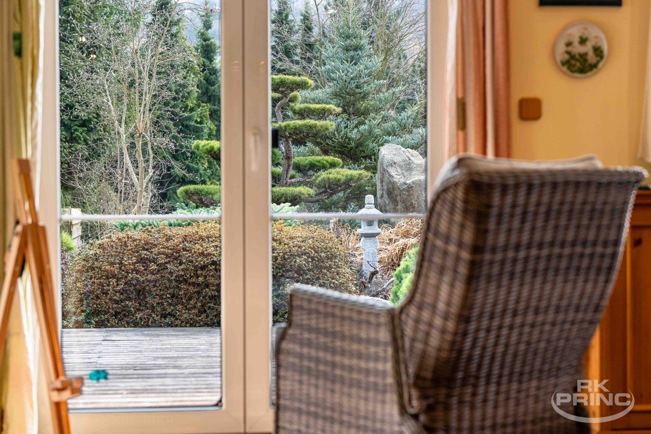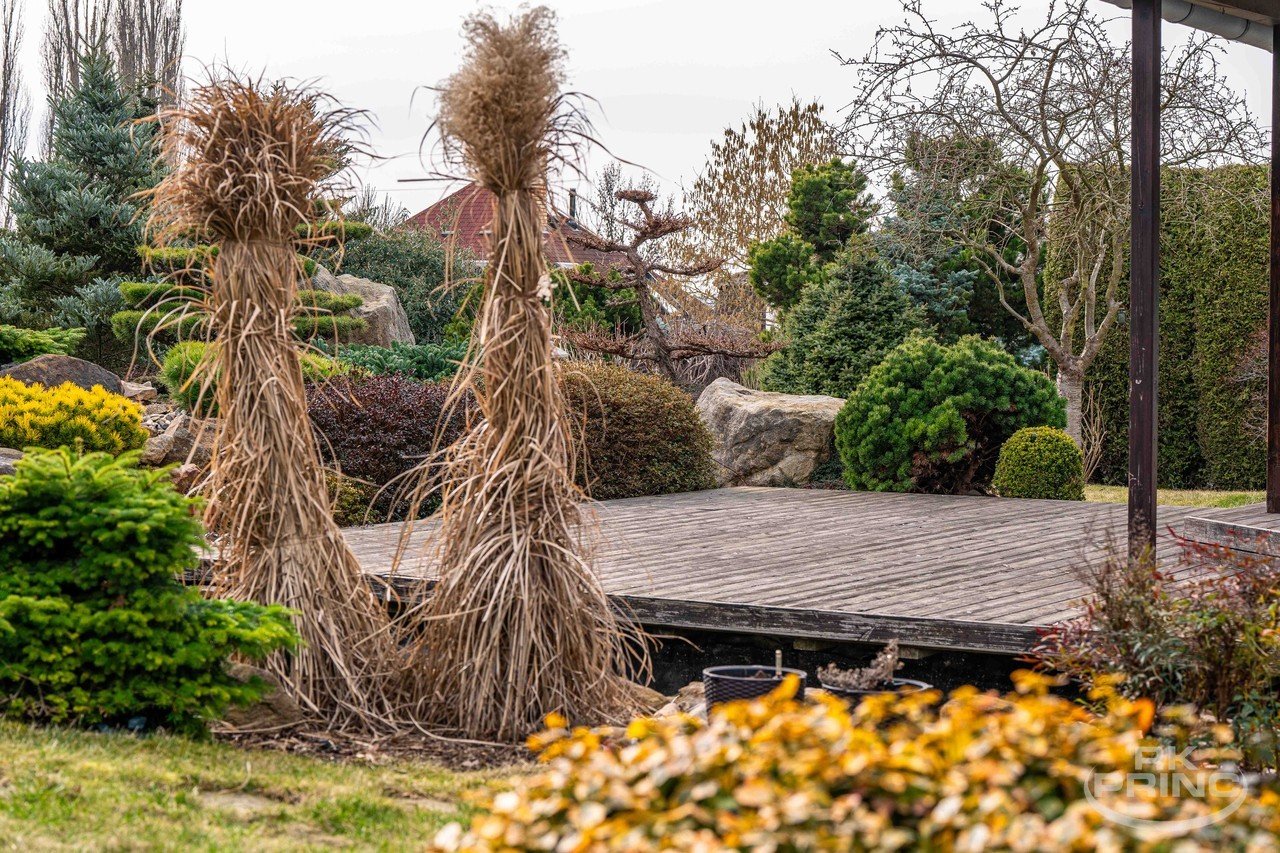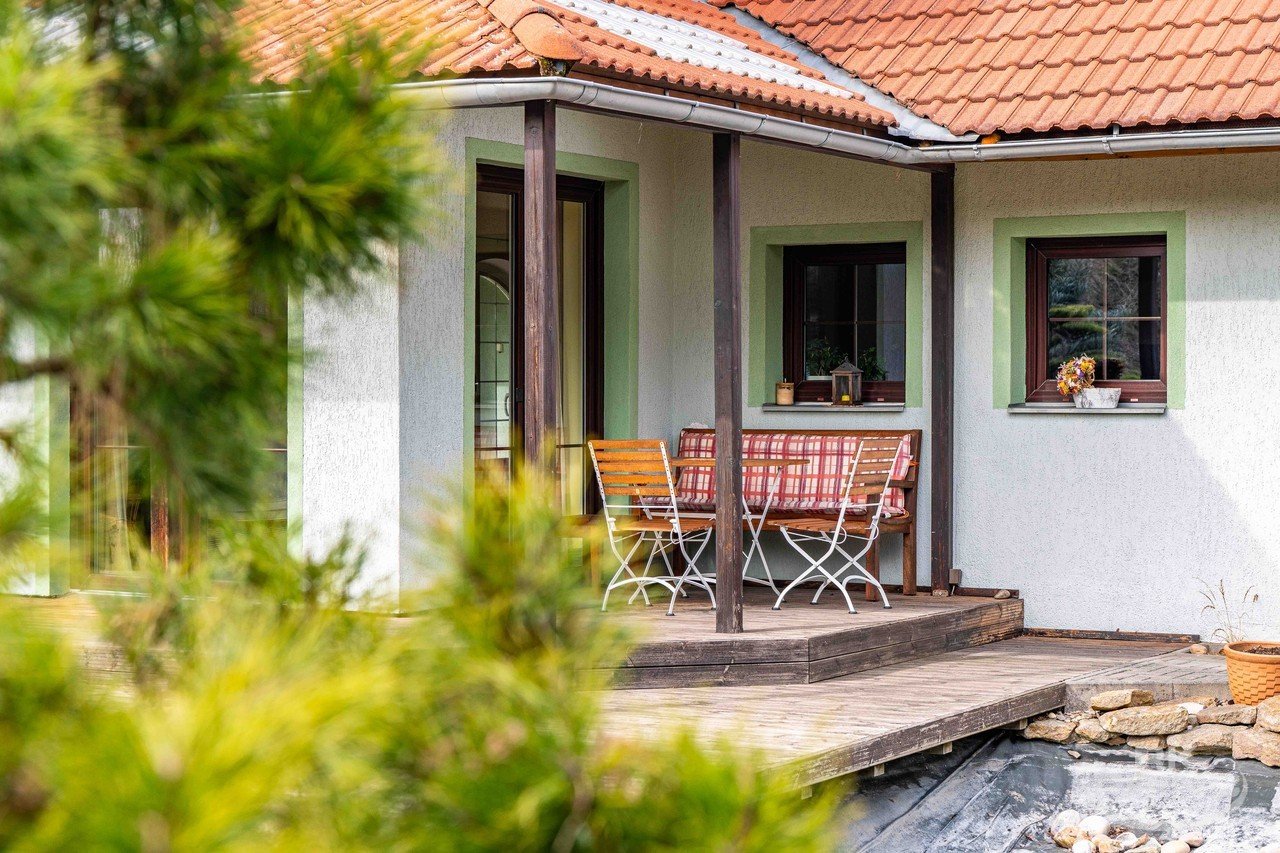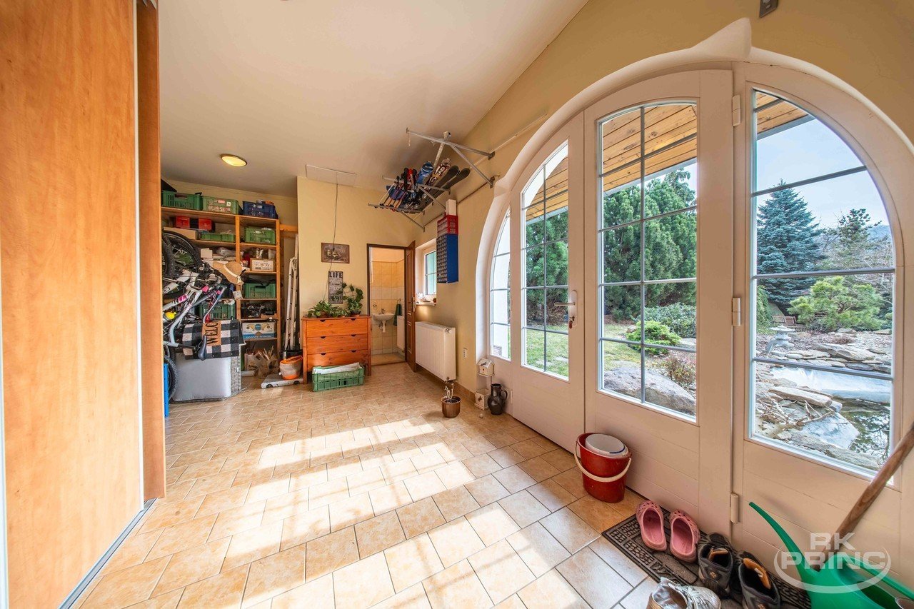 Pozemek o celkové výměře 1 925 m² poskytuje skutečný prostor pro život. Zahrada je harmonicky rozdělená na okrasnou a užitkovou část. Dominantou je jezírko s potůčkem a klidové patio, které vytváří ideální místo pro relaxaci. Nechybí ani ovocné stromy a prostor pro vlastní pěstování. Součástí je také samostatný zahradní domek se zavedenou elektřinou, vhodný jako zázemí pro zahradní techniku či další využití.