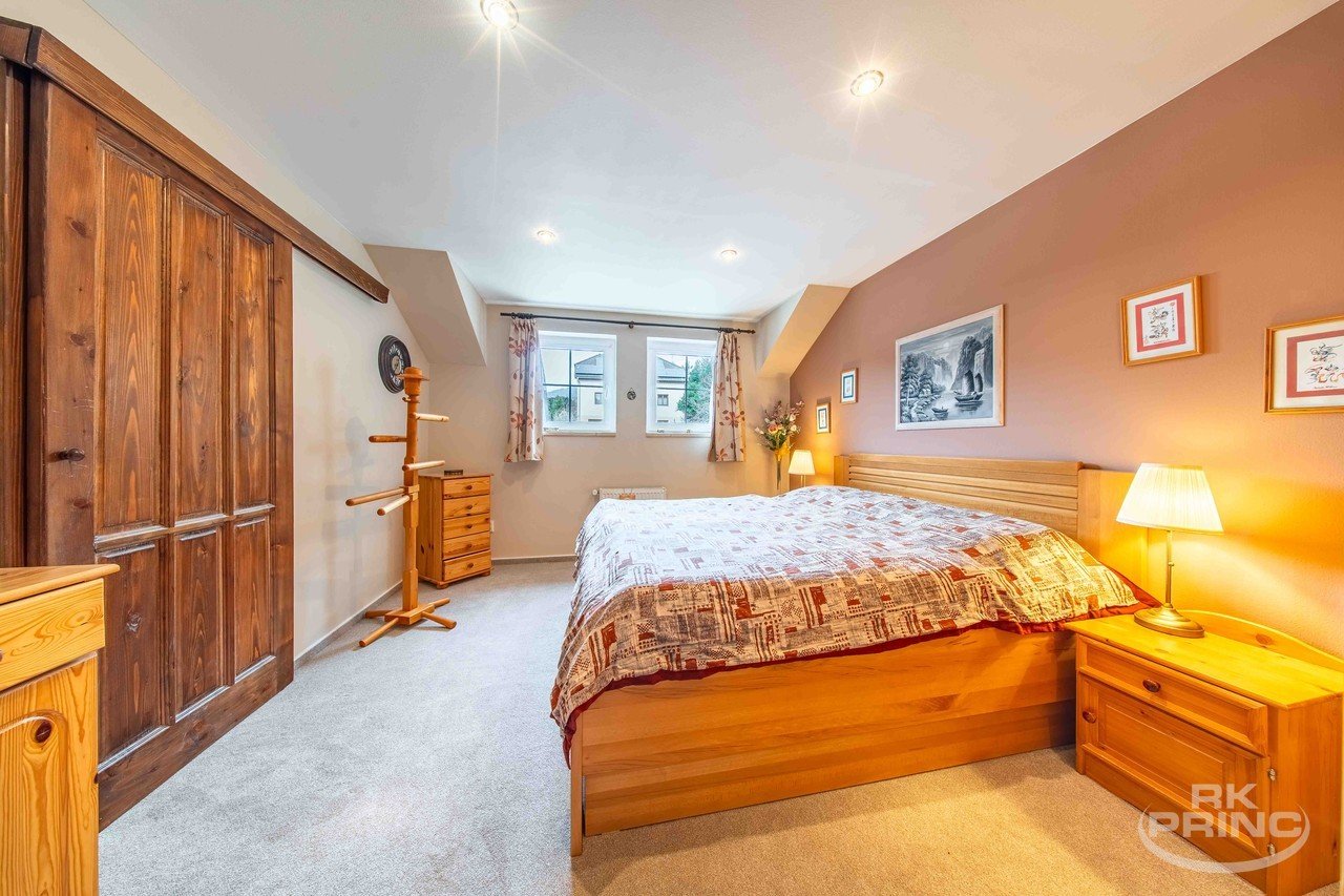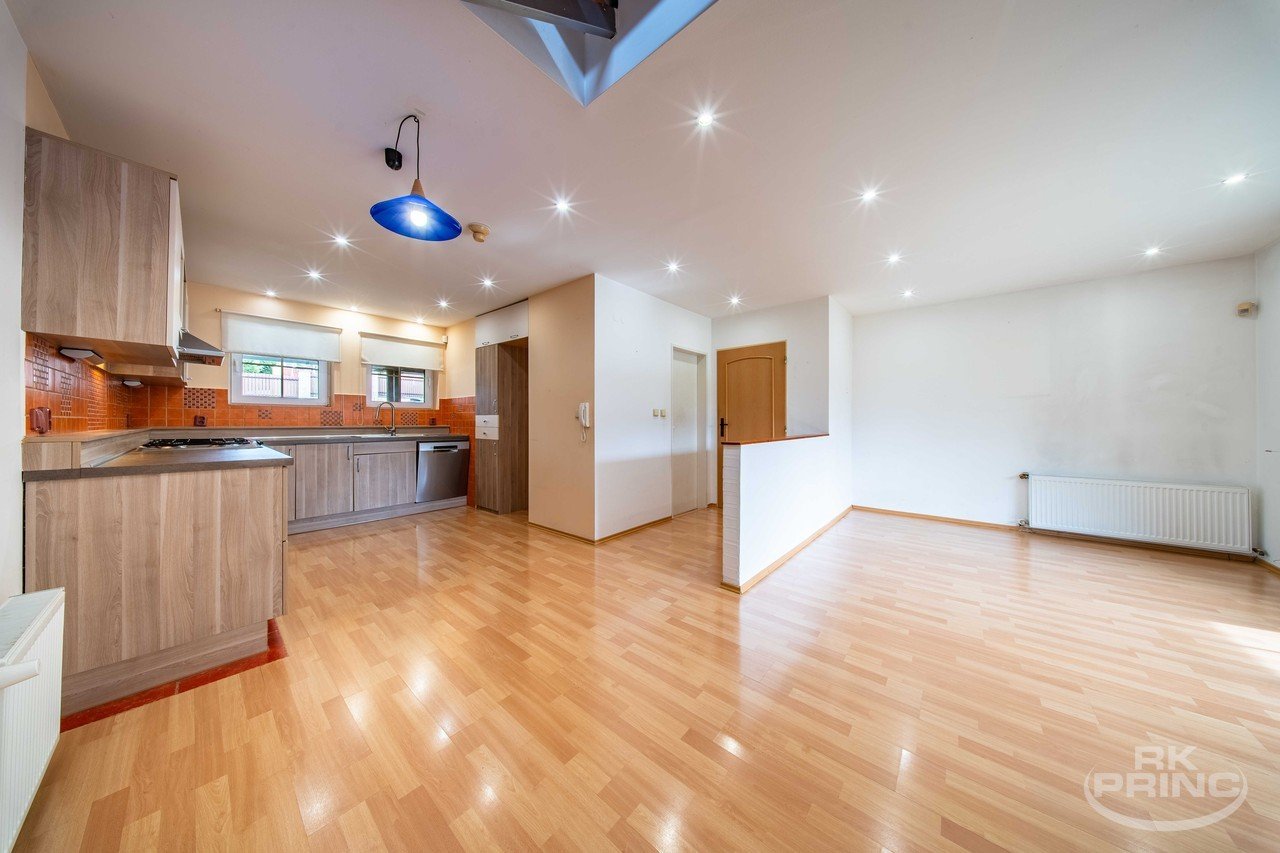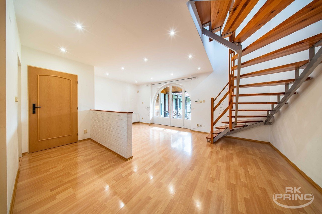 První bytová jednotka 3+kk je dvoupodlažní a aktuálně využívána jako nájemní prostor. Dispozičně nabízí v přízemí otevřený obytný prostor s kuchyní a koupelnou, v patře pak dva samostatné pokoje a druhou koupelnu. Tato část domu přináší okamžitý výnos bez nutnosti dalších investic či možnost bydlení ve více generačním stylu..